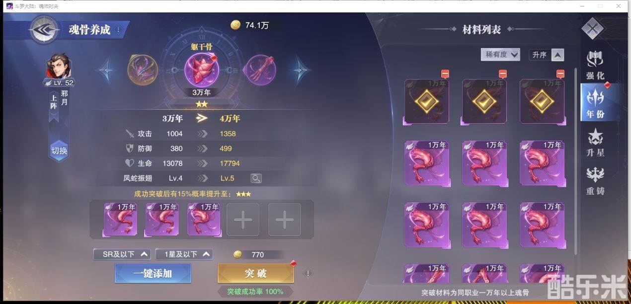 首先谈一谈魂环升年限这件事,魂环升级年限,需要的东西:1、相同系得sr万年魂骨,2等级达到相应条件。