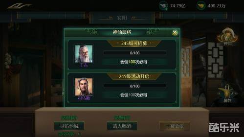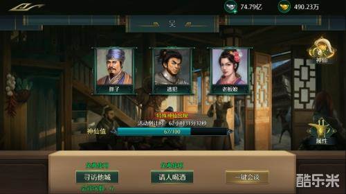 在策略游戏卧龙吟中,有一家酒馆不但可以请人喝酒、会谈,还可以在喝酒会谈中,获得大量的资源,比如战功、银两、 金币等,请人喝酒、会谈当神仙值达到100,就可以请神出来,可以获得武力、智力、兵力、统率来增加武将属性,各位主公可以根据自身情况,分配到自己心仪的武将身上,来增加战斗力。(切记哦,每项增加的属性都不能超过转生数)