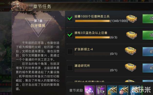 这里想要完成第七章的任务的话,小伙伴们,只需要训练一千个士兵就可以了,这对于小伙伴们来说还是非常容易完成的,在前期的战斗中,小伙伴们不知不觉中就将这个任务的进度提高到了非常高的程度上,其次的话,拥有三支蓝色以上的品质的巨兽,这点小伙伴们可以通过使用狩猎币来在狩猎场中获取更多高品质的巨兽,是不难完成的。