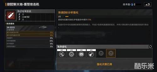 4、接下来就是该战机的防空方面的加点了,该战机放空手段只有防空导弹一种,主武器的火炮是不提供防空的,所以我们在防空导弹方面的加点如下:对空伤害+对舰载机命中。这里也要根据自己的实际情况考虑,如果你有可以提升已方战舰命中率的舰船,防空导弹加点可以考虑一下全点对空伤害,最高可以达到每分钟1192的对空伤害。