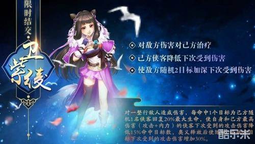 卫紫菱是本次返场中唯一一位纯辅助类的侠客。她能够在攻击后治疗友方侠客,奥义释放后可对敌方侠客施加伤害加深效果;并且,她的天赋中还具有减少敌方真气回复、破甲等强力辅助类技能。