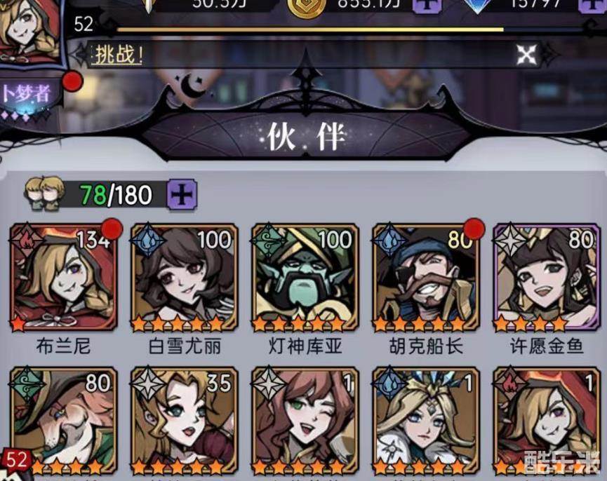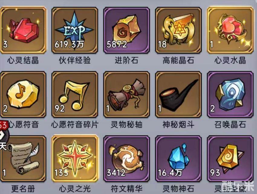 玩家进入游戏后,可以在伙伴中看到目前所拥有的所有伙伴信息和碎片信息。下方还包括符文,衣柜,灵物,布阵等。选择符文进入符文合成页面,玩家可以参与多个活动获得符文道具,当成功获得符文后,可以在背包或符文合成页面查询到符文信息。