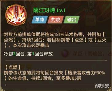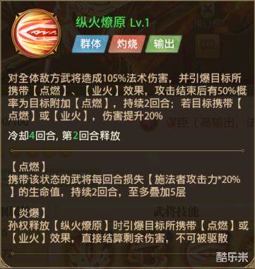 群攻技能,能有几率给对面上一层【点燃】或者【业火】,若后期对方武将已有这两个debuff则伤害提升
