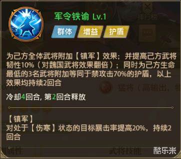 增益技能,提高己方武将10%的韧性,若是魏国阵营武将则提升20%,同时为己方生命最低武将提供自身生命70%的护盾。