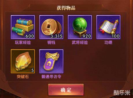 通关章节除了有玩家经验和武将经验之外,还会获得寻访令、功绩、突破石等高级道具,并且通关的关卡越多,后续的奖励越丰富~