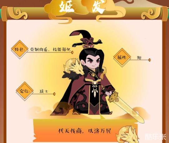 姬发是一名越战越强的输出型战士,对于肉盾角色,阴系角色有非常优秀的克制力,被动增伤的存在意味着只要姬发多存活一回合就能够造成更大的威胁,而普攻额外回怒也保证了姬发能够相对更频繁地释放技能。