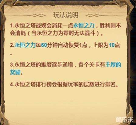 永恒之塔战败即会扣除玩家的1点“永恒之力”,胜利则不会消耗,而且每60分钟自动恢复1点,上限为10点。