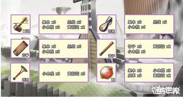 1、首先这些乐器都需要用到铜制制作台制作后才可以获得,同时每种乐器所需要的材料各不相同,冒险家要注意收集材料哦!