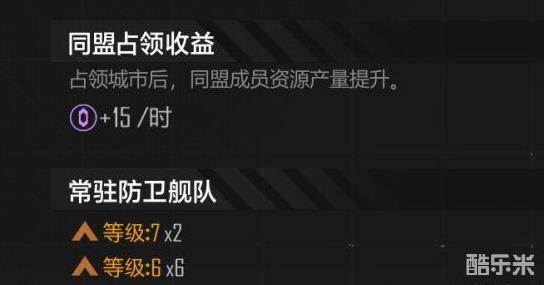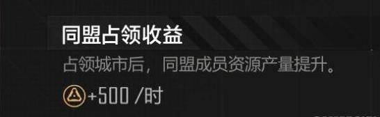 占领城市后,同盟所有成员都可以获得这座城市带来的资源产量提升。城市等级越高,资源产量提升的越多。同盟占领城市带来的收益是资源的主要来源之一。