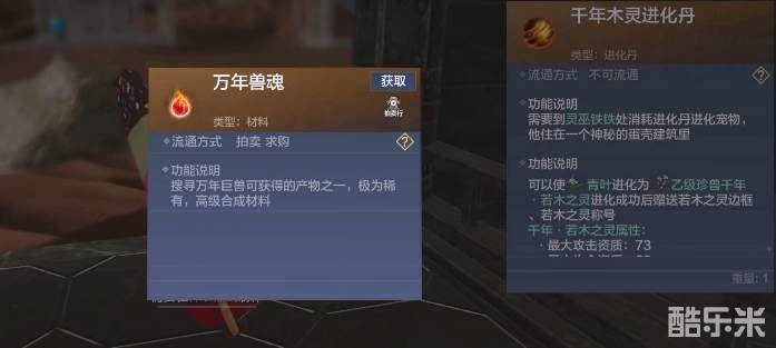 2、制作进化丹必不可少的是4个万年兽魂,具体的配方目前还没曝光,不过可能跟新出的万年异兽有关,比如幻尘液、骨鳞卷、拘魇鳞等材料,如果玩家刷到了都可以留下备用;具体的合成配方后续会为大家更新介绍;