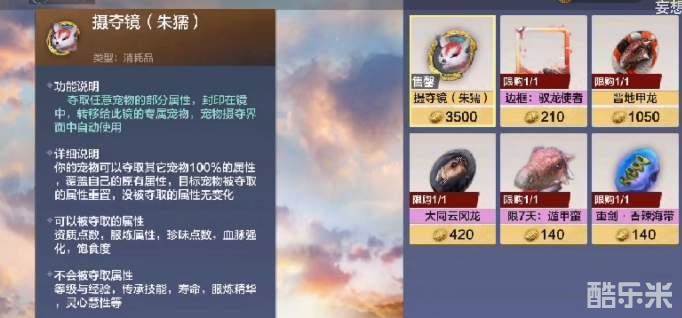 4、此外,通过参与活动可以获得摄夺镜-朱獳,可以帮助玩家们将其他爱宠物的属性资质转移到新的进化宠朱獳身上,资质点数、服炼属性、珍味点数、血脉强化以及饱食度都可以进行转移,避免重复养成。