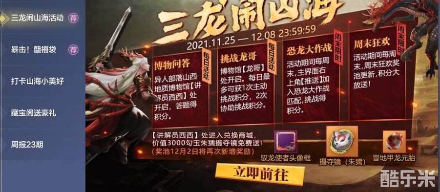 1、新版本“龙战于野”中上线了一系列全新的活动,参与“三龙闹四海”主题活动可以获取稀有道具摄夺镜(朱獳)