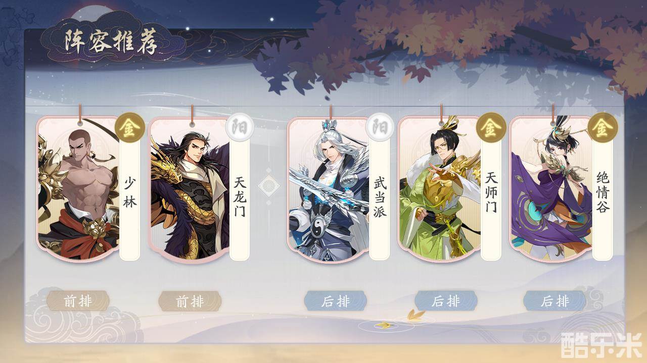 这套阵容灰常强劲,少林的群体护盾能提升防御能力,天师门能够不断地给武当派回内力,增加武当派绝技的持续时间,当武当派打到足够的范围伤害之后,再由绝情谷进场收割,压血线收割一条龙安排得妥妥当当。能够激活【同势力阵营5名侠客】的强力羁绊,增加25%的攻击力和生命值。