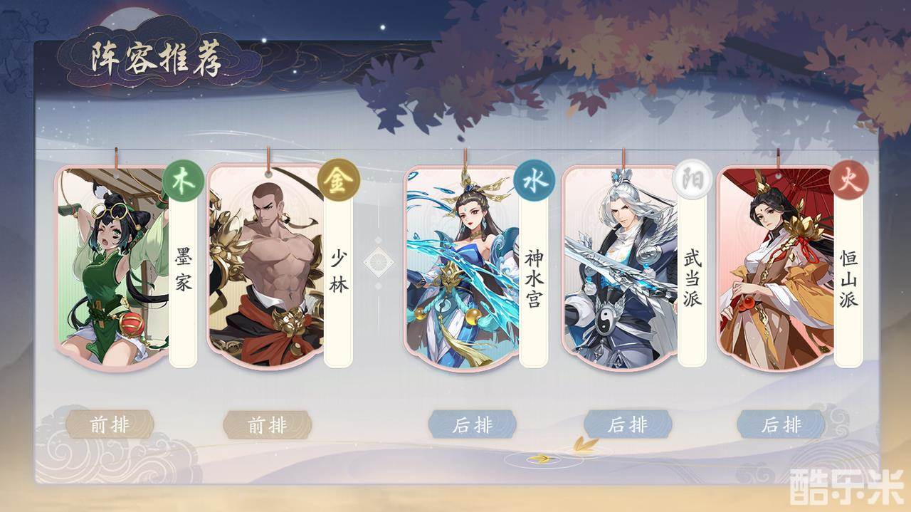 这套阵容同样强势,攻防两端都非常不错,墨家在作为前排的同时也可以充当副C,不会导致输出匮乏,神水宫能够持续削弱对手增强武当派范围性伤害的杀伤力,恒山派和少林能为队伍增加不错的防御能力提高容错率。能激活【金木水火各1名侠客】羁绊加成,增加10%攻击力和15%的生命值。