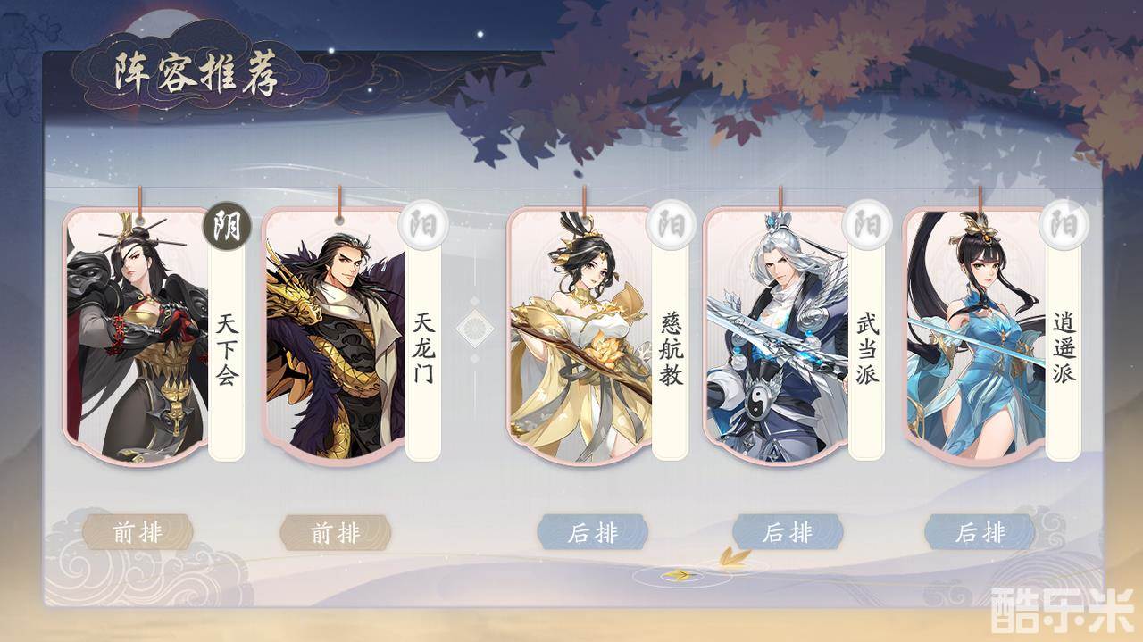 这是一套完美阵容,在防守方面,天下会能建立一座坚实的防御壁垒,同时能利用自己的群嘲属性为输出核心创建完美输出环境,在进攻方面,武当派、逍遥派能对敌方阵容造成大量范围伤害,天龙门也有不错的站场输出,同时,还有慈航教补足队伍续航,全方位无死角。能激活【同势力阵营4名侠客】羁绊加成,增加15%攻击力和20%生命值,阴属性侠客还能提供额外30%防御属性。
