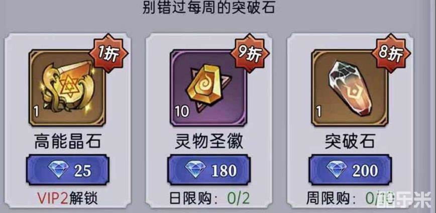 点击道具商店就可以购买突破石了,玩家需要用200钻石来购买,有10次购买机会,要是角色突破石不够的话,玩家可以点击积分功能区获取突破石,这一次不是用钻石,而是用积分币来购买突破石道具,点击购买即可。
