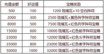 【活动内容】活动期间可通过充值金币获得好运值,积累好运值即可打开宝箱奖励,超多的琉璃瓦,大量的阵符宝箱,绝对超值的提升战力资源,尽在特惠好礼。