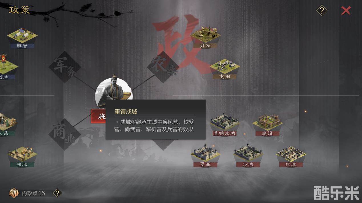 可担任分城参军,令该分城补给范围内己方3级和4级领地可开发,开发后领地等级提升1级,且产量额外提高100。