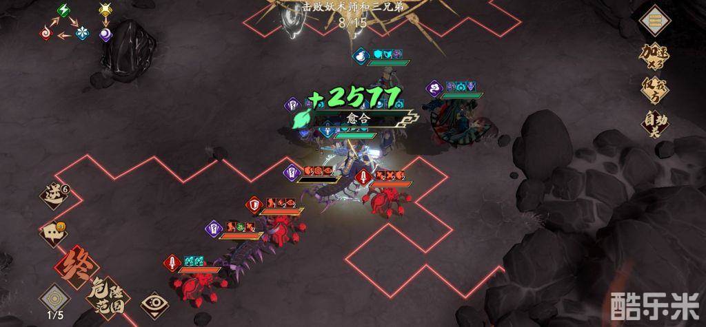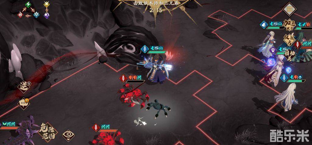幸运的话,无邪没有被禁疗,小雪甚至不用开大,不幸禁疗的话,小雪开大,黎幽跳晕刚才暗灭弹的那个蜈蚣,所有人对着它一通狂轰,冰璃二动,无邪顶着它开大,剑邪因为还带着加速,所以来去如风可以回撤,这样就可以脱离妖术师攻击范围,如下图,这回合结束,因为减速,无邪还会反死两只大蜘蛛,就剩两个小蜘蛛