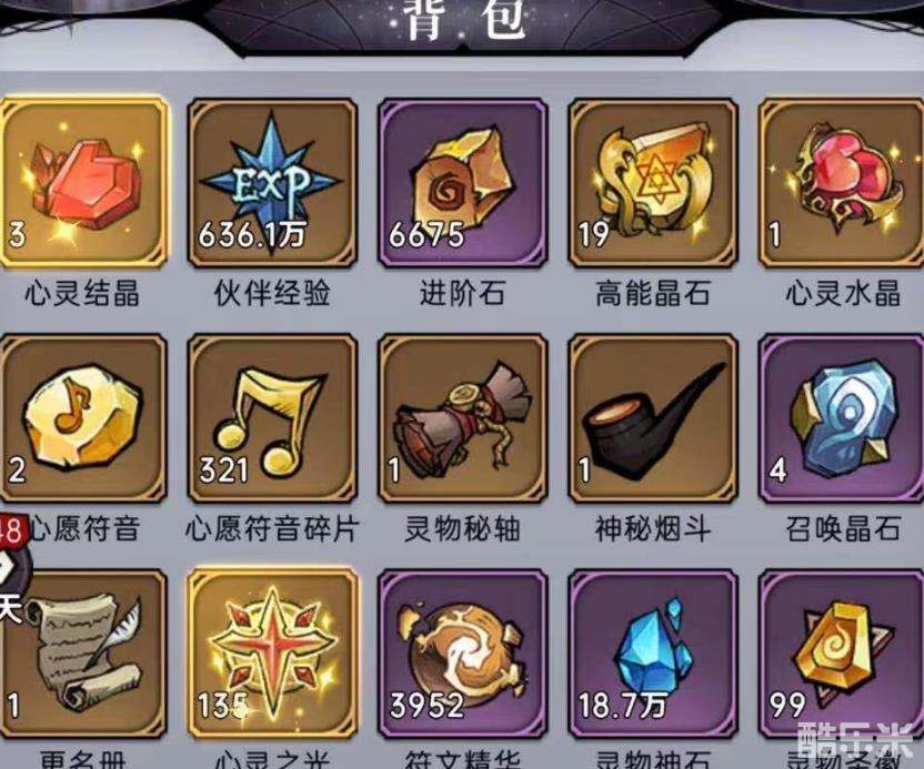 玩家进入主页面后,可以在背包中查询到目前所拥有的所有道具信息。其中包括符文精华道具。符文精华道具是符文分解后残存的精华,可以用于符文重铸和伙伴天赋升级,符文精华道具可以通过多种方式获得。