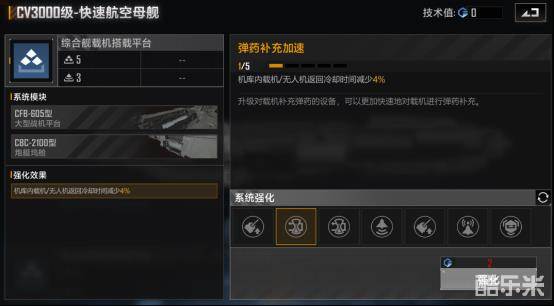 强化方面由于本身火力比较低,技术点优先投入到舰载机、动力系统与装甲系统上。动力系统的策略“机动规避”优先点,航母的生产成本和时间太高,点出策略可以大大增加存活率。其次是舰载机的冷却和伤害,有多余点数可以投入到移动速度上,因为航母的速度很慢。