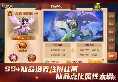 点化SS+仙品需要使用稀有的仙品精粹,每次点化都可以获得属性提升,包含数值和百分比提升。由于有百分比加成,点化在后期带来的属性加成非常可观,想要培养出强大的仙品必须重视点化。