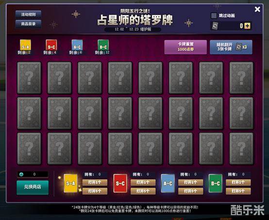 12月2日服务器维护后~12月23日上午7点玩家可以使用[塔罗抽取券]来进行翻牌!一次会出现24张卡牌,分别是黄金:2张/红色:4张/蓝色:6张/绿色:12张。每种卡牌被翻出来的概率都相同。未翻完24张卡片时可以消耗1000点券进行重置。翻完24张卡牌后可以免费进行重置。卡牌重置后可以重新翻24张卡牌。卡牌重置后重新出现的卡牌中每个等级卡牌数量不变。
