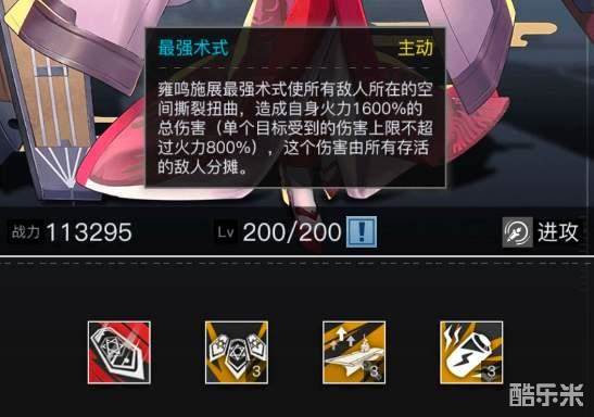 4、1级技能撕裂敌人所在的空间,造成自身火力6600%的总伤害,多个敌人分摊这个伤害;因此在场敌人的数量越少,这个技能造成的伤害越高;单个目标受到的伤害上限不超过火力400%;