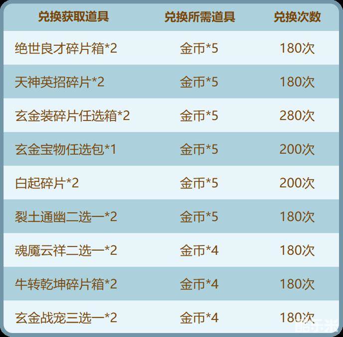 1、「欢乐金币」可以兑换:绝世良才碎片箱、天神英招碎片、玄金装碎片任选箱、玄金宝物任选包、白起碎片、裂土通幽二选一、魂魇云祥二选一、牛转乾坤碎片箱、玄金战宠三选一、伏波军师碎片箱、琉金翅膀精华等。