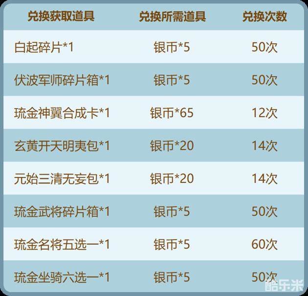 2、「欢乐银币」可以兑换:白起碎片、伏波军师碎片箱、琉金神翼合成卡、玄黄开天明夷包、元始三清无妄包、琉金武将碎片箱、琉金名将五选一、琉金坐骑六选一、琉金神兵碎片箱、琉金装碎片任选箱、琉金宝碎片任选包、穷奇琉金五选一、云麾龙骧碎片箱等。