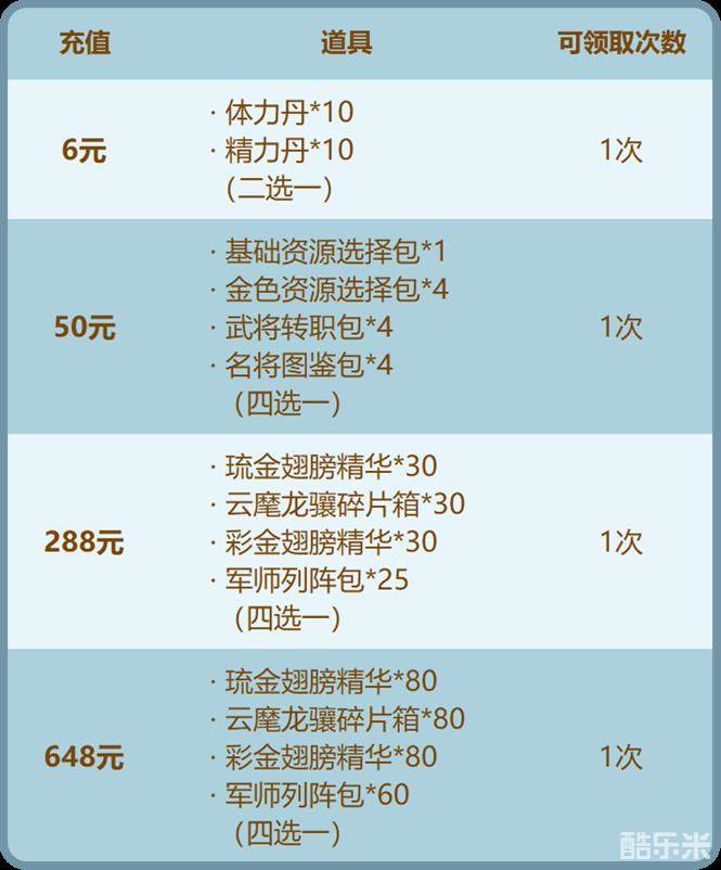 少年们单笔充值指定金额,即可得到琉金翅膀精华、云麾龙骧碎片箱、彩金翅膀精华、军师列阵包等珍稀道具!并且可以和欢庆佳节中的充值活动叠加,少年们千万不要错过哟~