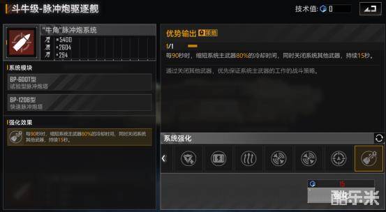 得益于能量武器的优势,斗牛级也成为输出数一数二的驱逐舰,培养方向上当然是以脉冲炮的火力为主,优先点出冷却时间、伤害,需要注意在能源系统板块也有可以强化脉冲炮冷却和伤害的地方,策略方面不是很推荐点出,点数留在命中和闪避上更为合适。