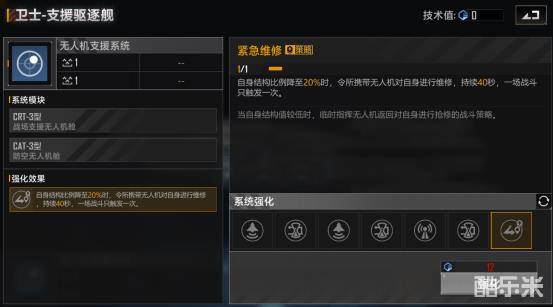 同样是拥有防空无人机和维修无人机的驱逐舰,后排站位不容易受到攻击,培养方向上和卫士级一样以维修支援为主,“紧急维修”同理必点,其次是无人机维修效果与返回冷却时间,单从效果强化来看,苔原级是比卫士级奶量更高的,实际体验下来两者差不多,都是好用的维修支援舰船。