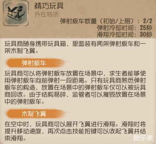 4、玩具商优势是利用弹射板车和木质飞翼大距离拉开监管者,转点还能有比较好的视野。