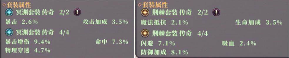 分析:从套装属性来看,冥渊套装主进攻,荆棘套装主防御,由于影刃的定位是近战爆发输出,所以影刃对于套装的选择应该是冥渊套装(极个别的可以选择荆棘套装,比如千棘)