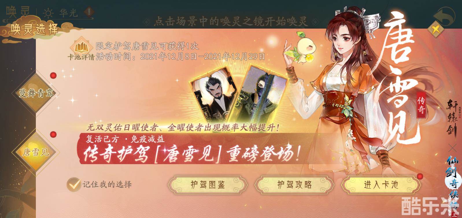 12月8日6:00至12月29日5:59,《轩辕剑龙舞云山》x《仙剑奇侠传三》联动护驾“唐雪见”卡池特典限时开启,传奇护驾【唐雪见】、无双灵佑【日曜使者】与【金曜使者】获取概率皆大幅提升!成功召唤特典护驾或指定灵佑、累积唤灵达一定次数,还能解锁无双灵佑契约、浮光云锦及梦泽灵珀等丰厚奖励!