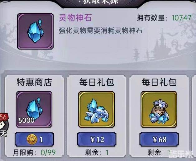 第二种方法就是在商店里进行购买,玩家可以找到特惠商店,然后花费一个特惠积分就能够买到5000个灵物神石,每个月限购99次。