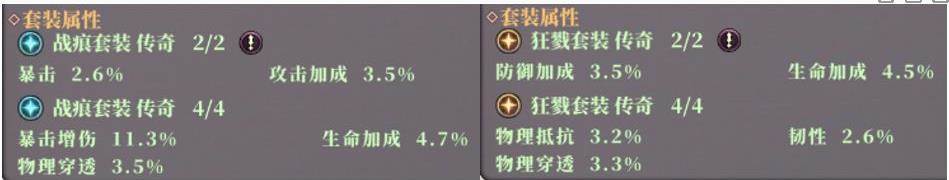 分析:从套装属性来看,战痕套装主进攻,狂戮套装主防御,由于战士的定位是近战输出,所以大部分战士对于套装的选择应该是战痕套装(选择走防御战路线的可以选择狂戮)。