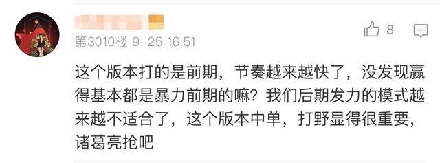 这位来自于微博昵称为“tinahoney”的网友说道:“这个版本打得是前期,节奏越来越快了,没发现赢得基本都是暴力前期的吗?我们后期发力的模式越来越不适合了,这个版本中单,打野显得很重要,诸葛亮抢吧。”