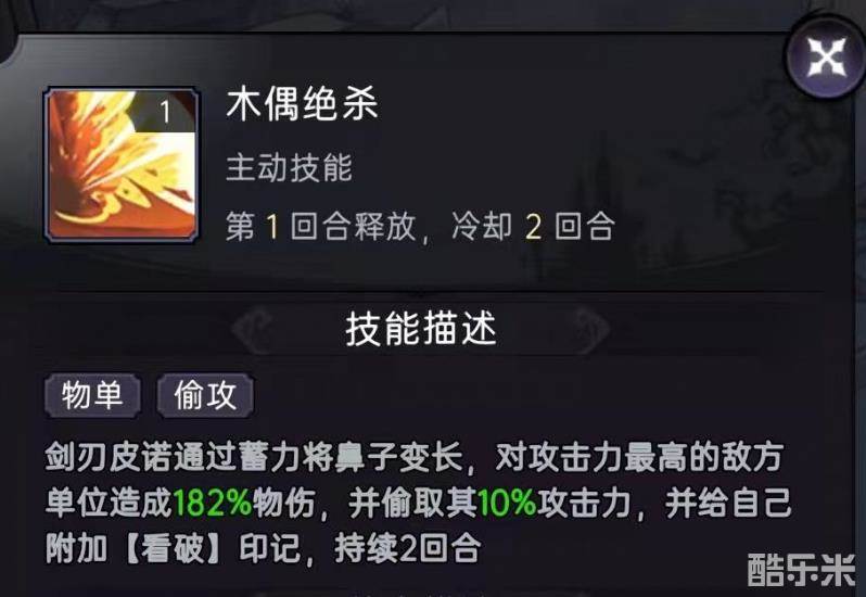 剑刃皮诺是属于火系的角色,作为一名战士,剑刃皮诺的主动技能可以直接攻击对方攻击力最高的目标,同时偷取攻击力。必杀技的效果是可以伤害一列敌人,并且有几率附加燃烧效果,同时有几率为伤害目标附加混乱状态,被燃烧的目标在后续的两个回合内,会持续受到伤害。所以小编推荐大家选择同样具有燃烧效果的伙伴,这样组成阵容之后,可以将效果最大化。