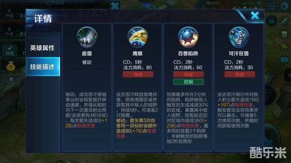 追猎:成吉思汗经过草丛可以获得加速效果,并且强化下一次普通攻击,使得成吉思汗有着非常良好的灵活性以及输出能力,成吉思汗只要善用草丛,往往可以获得非常高的收益。