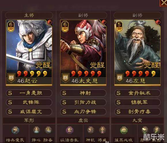 赵云(群):武锋阵+威谋抗靡;惜兵爱民+静心+防备