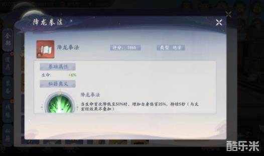 2、重点是北傲决和降龙拳法,都是生命值低于50%触发,(一个加40%攻速一个加25%的伤害),再配合至阳剑意的每减少1%的生命值就增加2%的攻速;