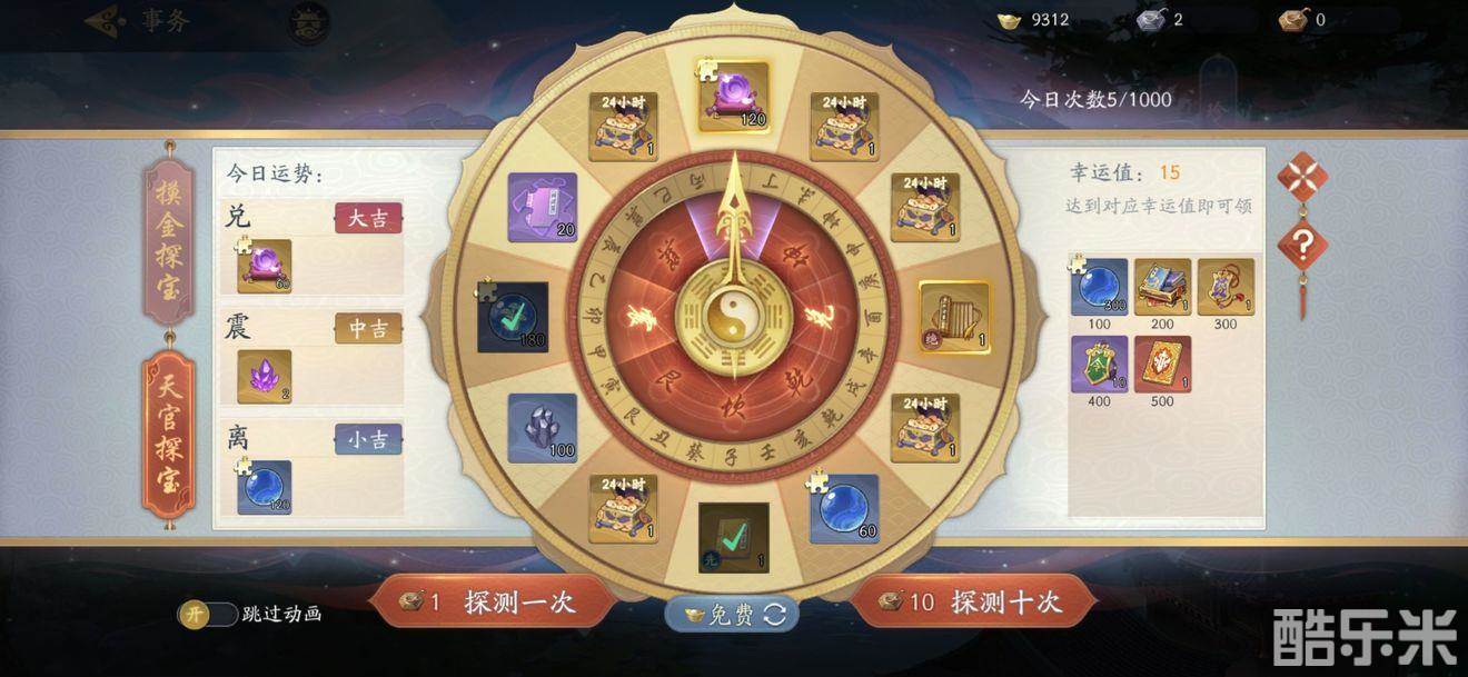 1、探宝罗盘这里各位一定要刷新吉运和大奖,最优长期来看肯定首选一万突破丹,这个后期会卡。