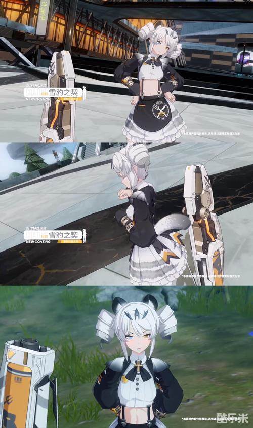另外一件涂装,是卡列尼娜·烬燃的专属特效涂装【雪豹之契】,是露腰的黑白裙设计,形如可爱的茶屋少女,更为难得是,卡列的背面还有一团毛绒绒的雪豹尾巴,不安地摆动。据说猫科动物的尾巴可以透露情绪的,指挥官你有猜到卡列此刻的心中所想了吗?