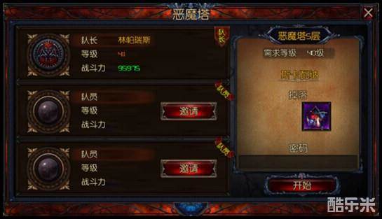 打“恶魔塔”的时候可以进行组队作战,首先依据自身实力选择“层数”,之后点击“快速创建”建立队伍,可以选择单刷,也可以邀请两个小伙伴一起,队伍确认后点击“开始”即可进入恶魔塔挑战Boss。