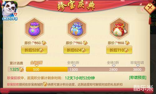 12月10日8:00至12月24日8:00期间,珍宝商城的栏位额外增加2个,同时在珍宝商城消费可获得珍宝积分,达到目标积分便可获得珍宝礼包的消费折扣,活动结束后礼包购买将在12月31日8:00截止。同时世界祝福、帮派红包、普天同庆可享6.8折优惠,少侠等级达到60级时,奇货商店增加与角色等级适应的装备灵礼包售卖。