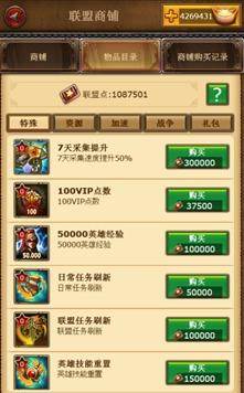 联盟中商铺是吸引成员的最主要途径。联盟商铺分为商铺和物品目录,在此购买物品需要忠诚点和联盟点,联盟点只有盟主才能进行使用。忠诚点则是在商铺中购买物品所需要的。