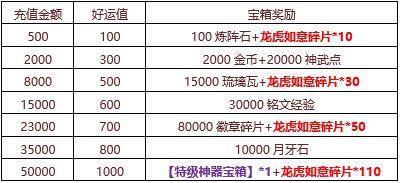 【活动内容】活动期间可通过充值金币获得好运值,积累好运值即可打开宝箱奖励,闪耀称号,全新神器,绝对超值的提升战力资源,尽在特惠好礼。
