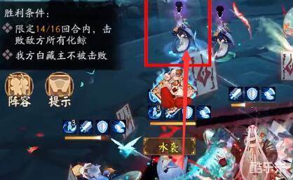 3、阴阳师残局得胜第六天三段需要在保证白藏主不死,并且16个回合内击杀所有化鲸,开局要白藏主开大、大蛇拉小白白藏主普通攻击,套上齿甲不知火等角色给大上普攻就可以了。